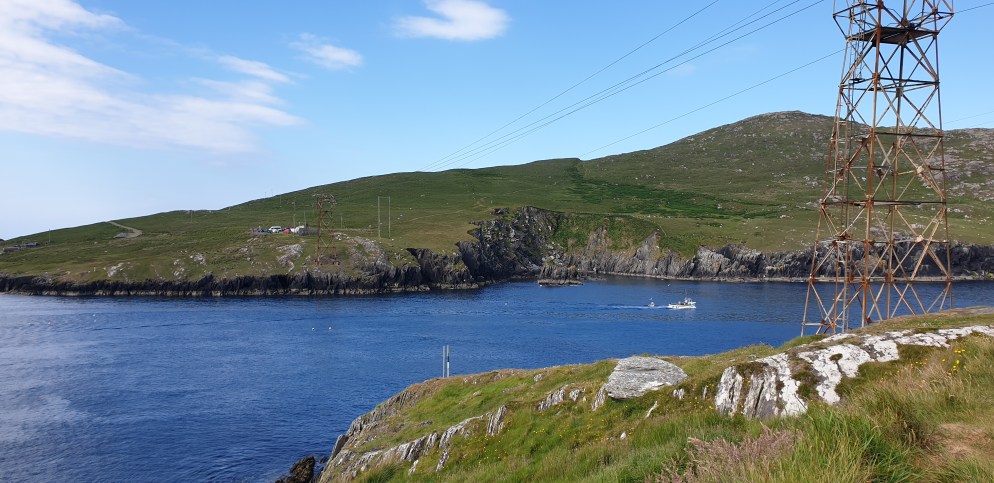 The middle finger of the five is the Beara Peninsula. We set off to explore in blazing sunshine and brilliant blue skies, starting with two ‘firsts’. Me driving for the first time and also showing some bare leg skin at last by getting out of the jeans and into the peddle pushers. It must be warming up….in fact the Irish are bracing themselves for a heat wave later this week, expecting temperatures to soar to 29C! Once again, the route to the end of the peninsula started off being reasonably wide, at least allowing you to pass cars coming in the opposite direction without slowing down. It rapidly narrowed, until it became a case of backing up and finding a layby if needed. Luckily, it wasn’t super busy, and confrontation was largely avoided. Our aim, of course, was to reach the end of the peninsula, this time for a special reason. Ireland’s only cable car was sited at the end, carrying passengers over to Dursey Island. This is where the cable car crosses the water.