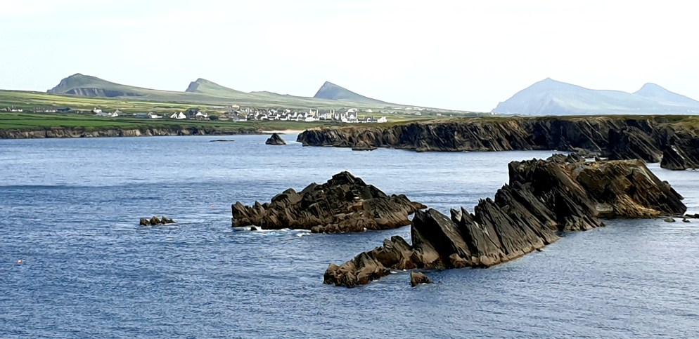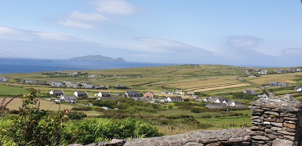 Mr Thumb aka Dingle, was explored using the old ‘ABC logo rule’. In other words, trying to choose a route without repeating any roads already travelled. We did pretty well. Starting at Castlemaine we took a goat trail up over the Dingle peninsula to Camp, then back over the other side to Anascaul, along to Dingle Town, through a valley to Dunquin and back across to the north again via the Connor Pass to Castlegregory, then once more south over the mountains to Inch! Dingle town was very busy. Summer has begun in Ireland. It was a beautiful day, and the place was heaving. For some unknown reason, we decided to take on the Slea Head loop road anticlockwise (well it worked on the ROK). Apparently the views are better when you go clockwise, which we soon found out would have been much cleverer. Not because the views weren’t amazing the way we were going, but because of the extremely narrow roads and the hundreds of buses coming in the opposite direction! What a nightmare! Nevertheless, our road trip took us to a gorgeous clifftop walk towards Sybil Head and the Three Sisters,