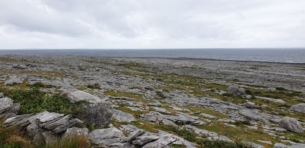 The Burren derives its name from the Irish word boireann meaning “stony place”. The landscape is quite stark with huge rocky mountains reaching right down to the sea.