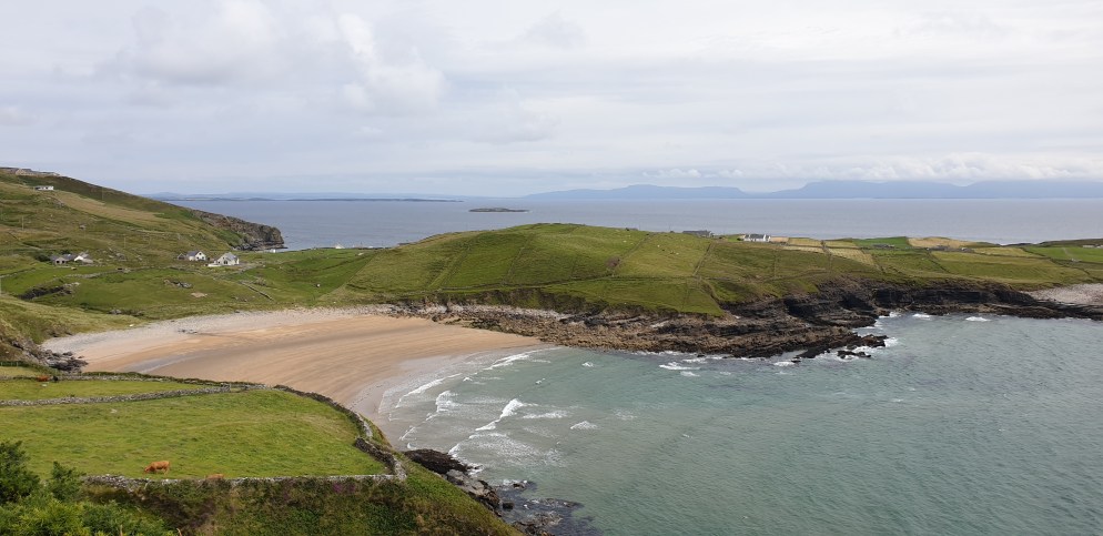 The scenery is more rugged and wild here, and it feels quite isolated. The boggy fields are dotted with white stones and the occasional startlingly white cottage, the land criss-crossed with low stone walls either built vertically up steep bare mountains or gently rolling down to one of the hundreds of little lakes or inlets.