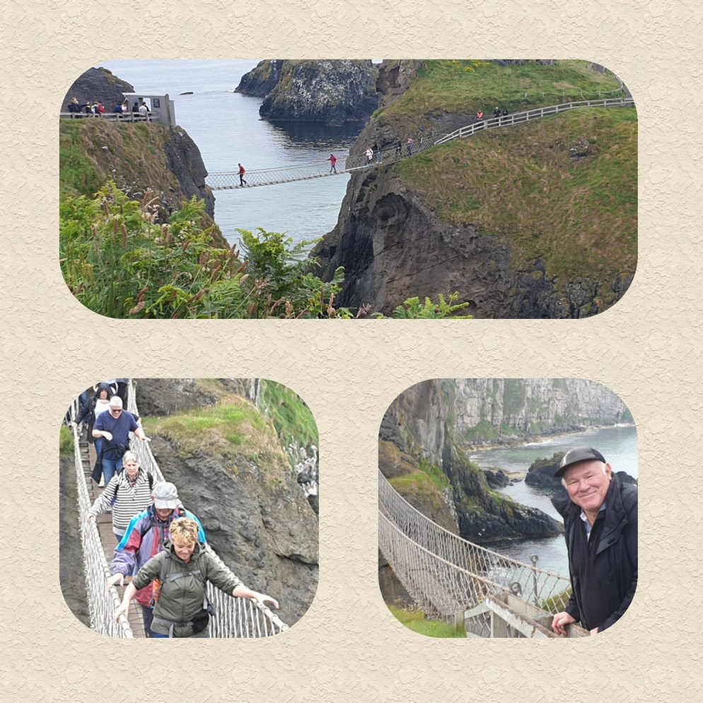 Only about 10kms further along the coast is the Carrick-a-Rede Rope Bridge. Built by fishermen to reach a rocky outcrop off shore, a 1m wide structure of wire rope and planks sway 30m above a chasm of swirling water. Not the most pleasant of experiences!