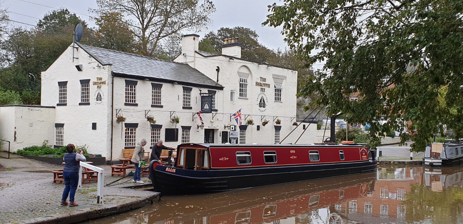 Ominous raindrops were falling on our roof as we woke up this morning. We all snuggled in and hoped they’d go away! Miraculously, after brekky, it stopped long enough for us to replenish the water supply and take the quintessential photo of Ellie moored at The Shroppie Fly.