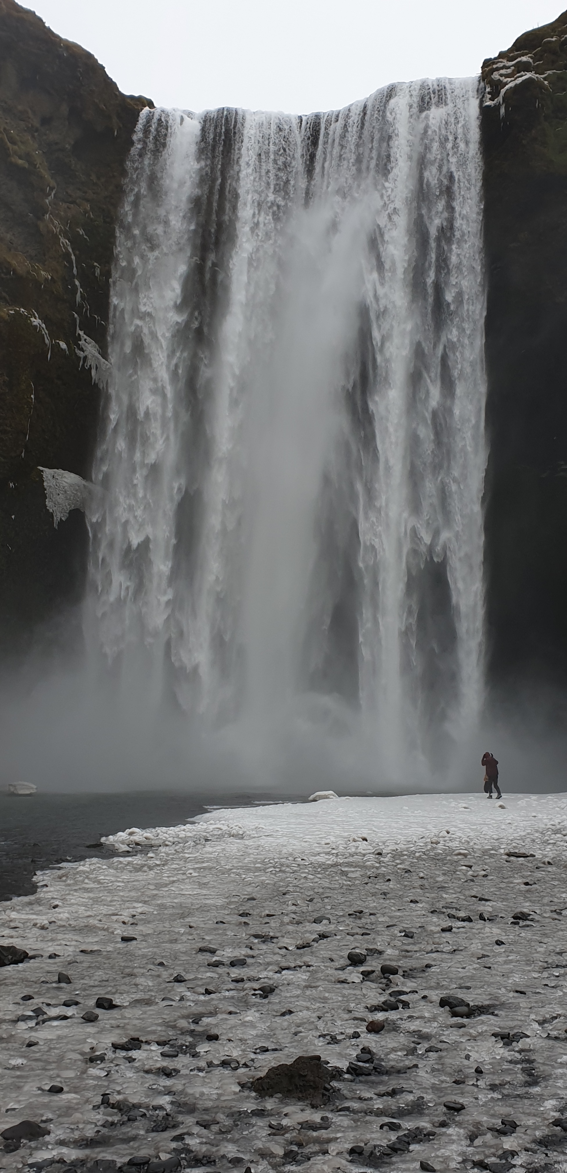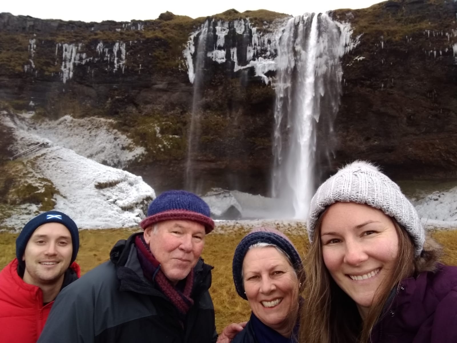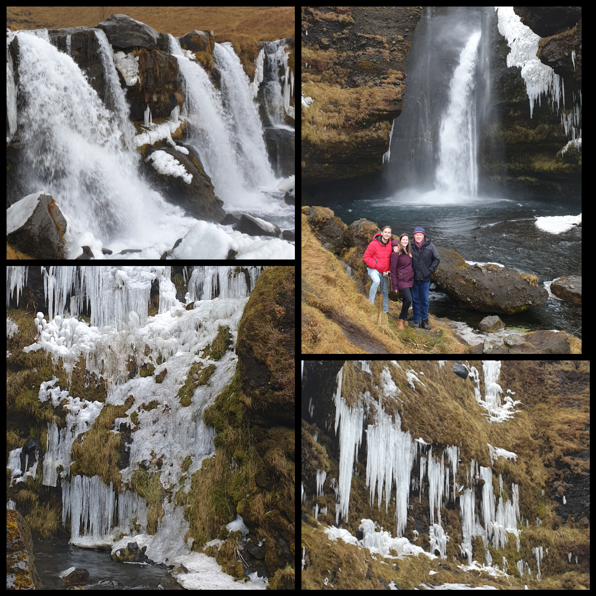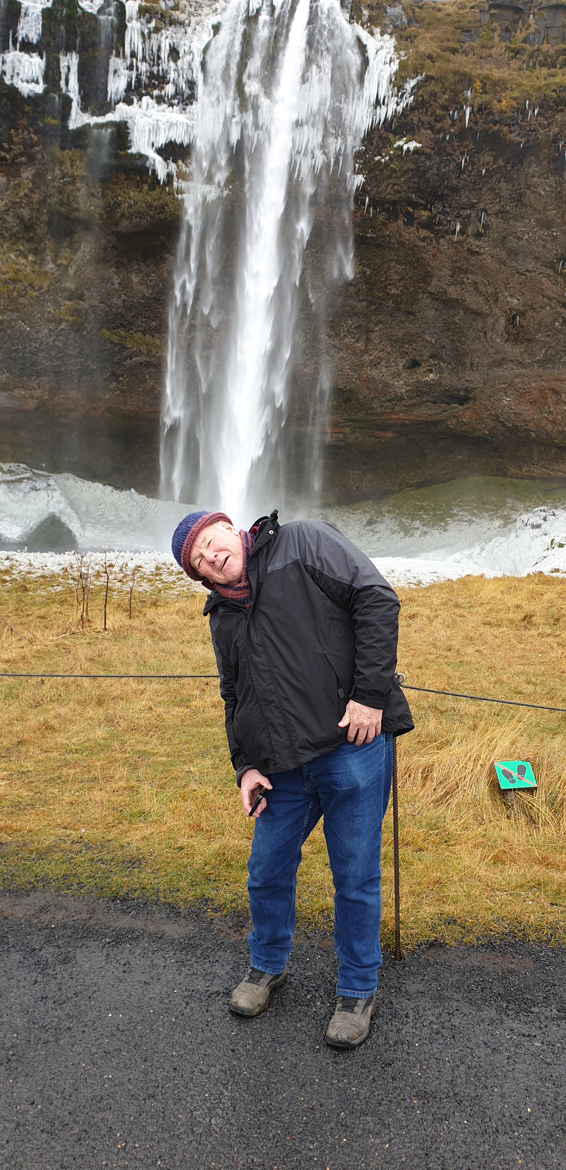Back on Highway 1, Seljalandsfosss soon came into view. This is the waterfall you can ordinarily walk behind, but as the path had iced over, it had been closed. We jostled to try and take a pic of this beauty without thousands of tourists in it. Hard going!