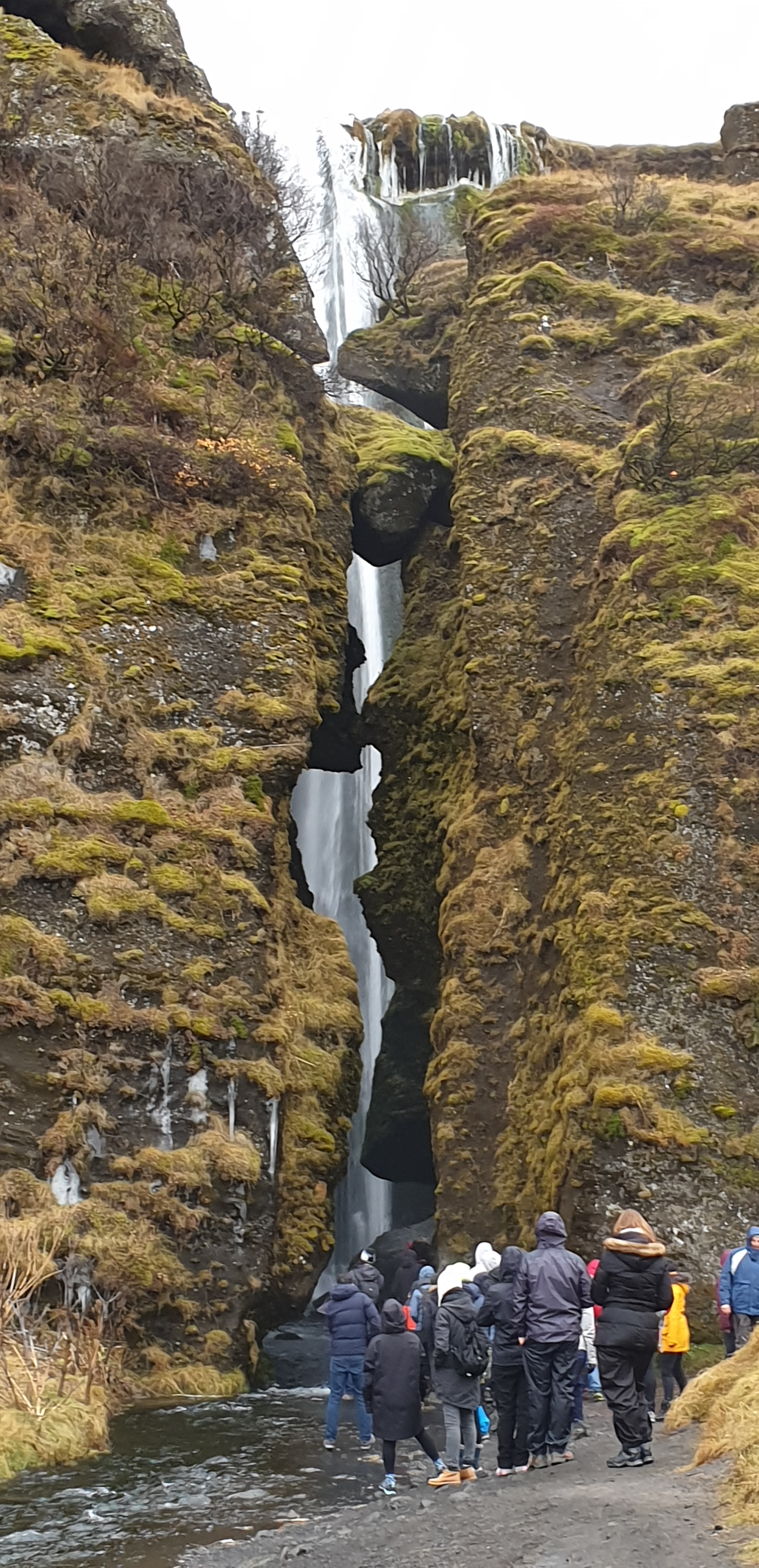 We were not so lucky grabbing a pic with no tourists 100m up the road at Gljúfrabúl. The waterfall cascades over the escarpment edge into a very narrow gorge, almost a cave really.