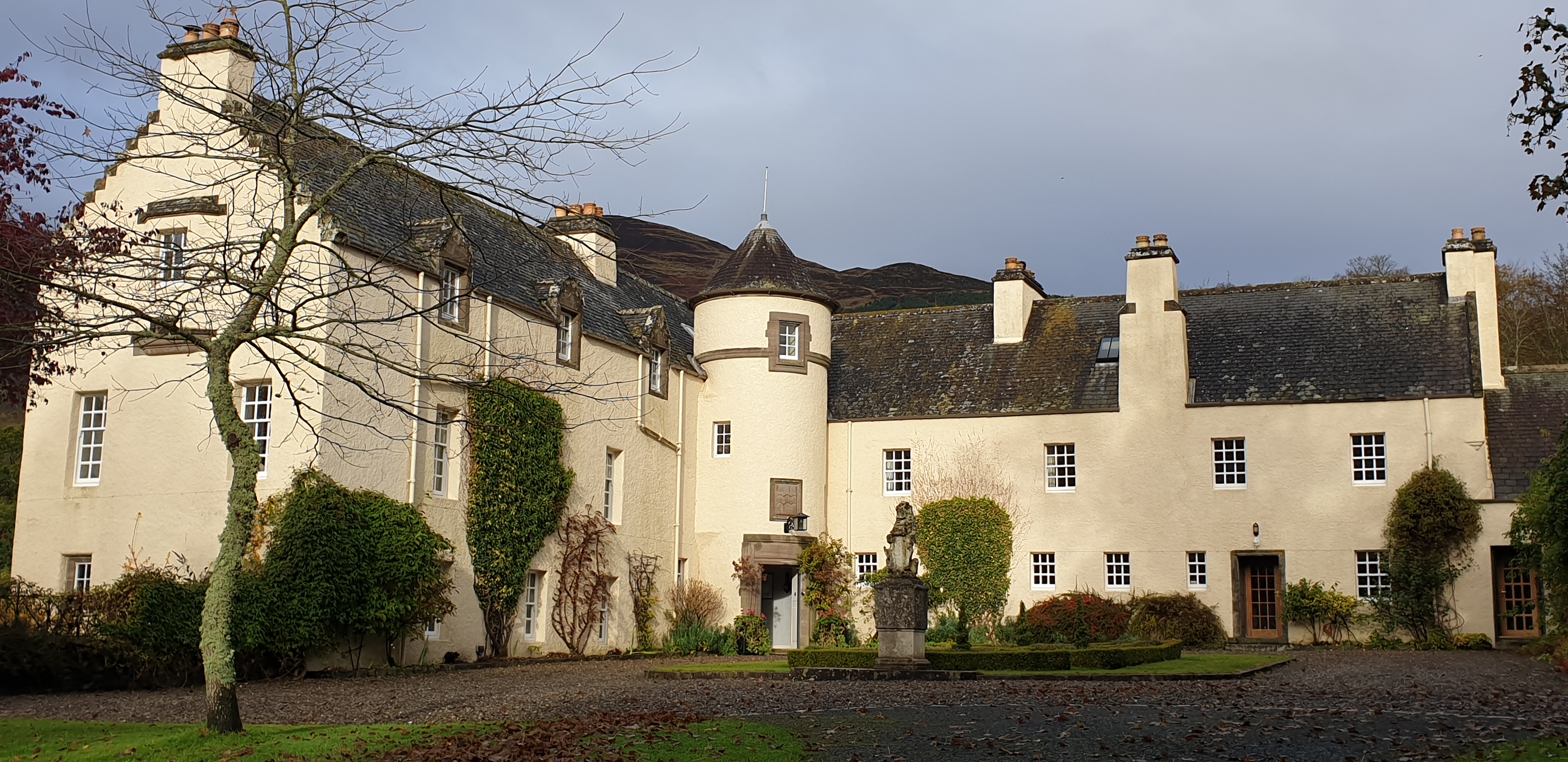 Our mission of course, was to find Glenlyon House. We knew it would be closed for the winter but hoped we’d get permission to take some pics of the outside. We found it easily, just on the edge of historic Fortingall village. There were several cars around, but no people. We knocked on doors, no answer. So we just wandered around and happily snapped away!
