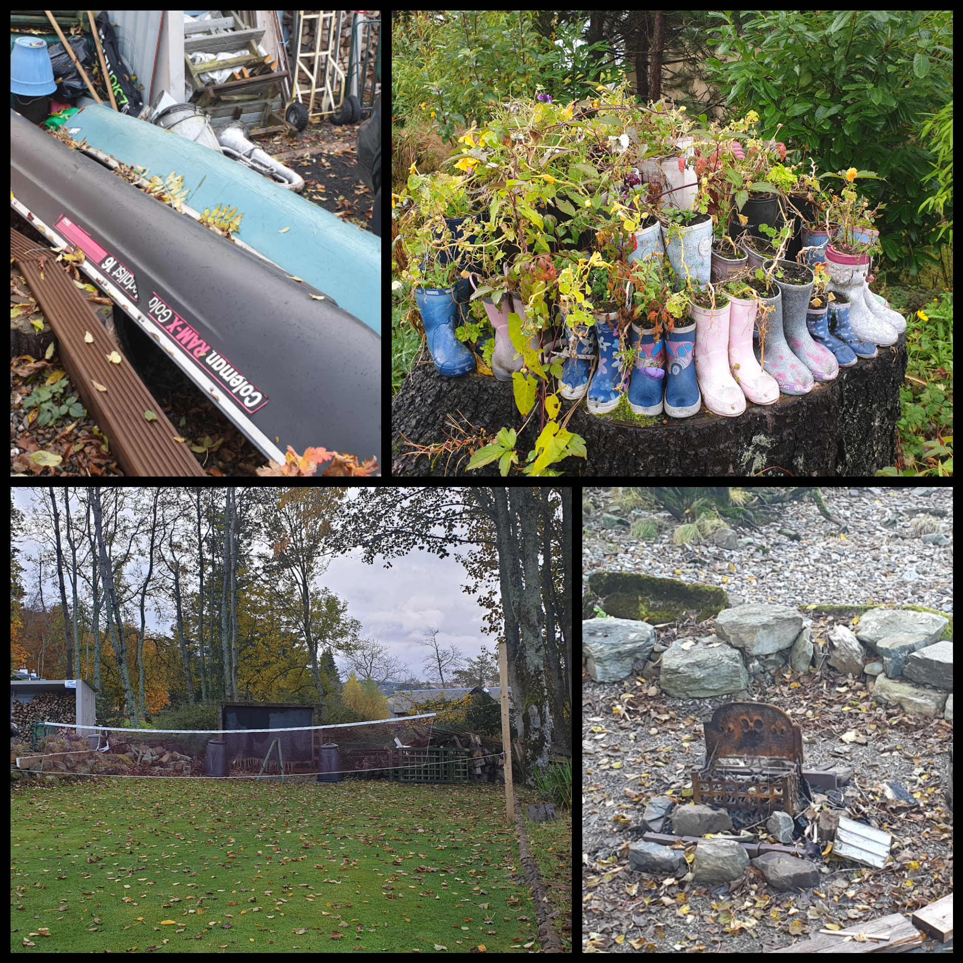 The loch frontage belongs to the house, and is like their back/front garden. We could see evidence of a well-used holiday home. Canoe shed, badminton court, fire pit, welly boot display.