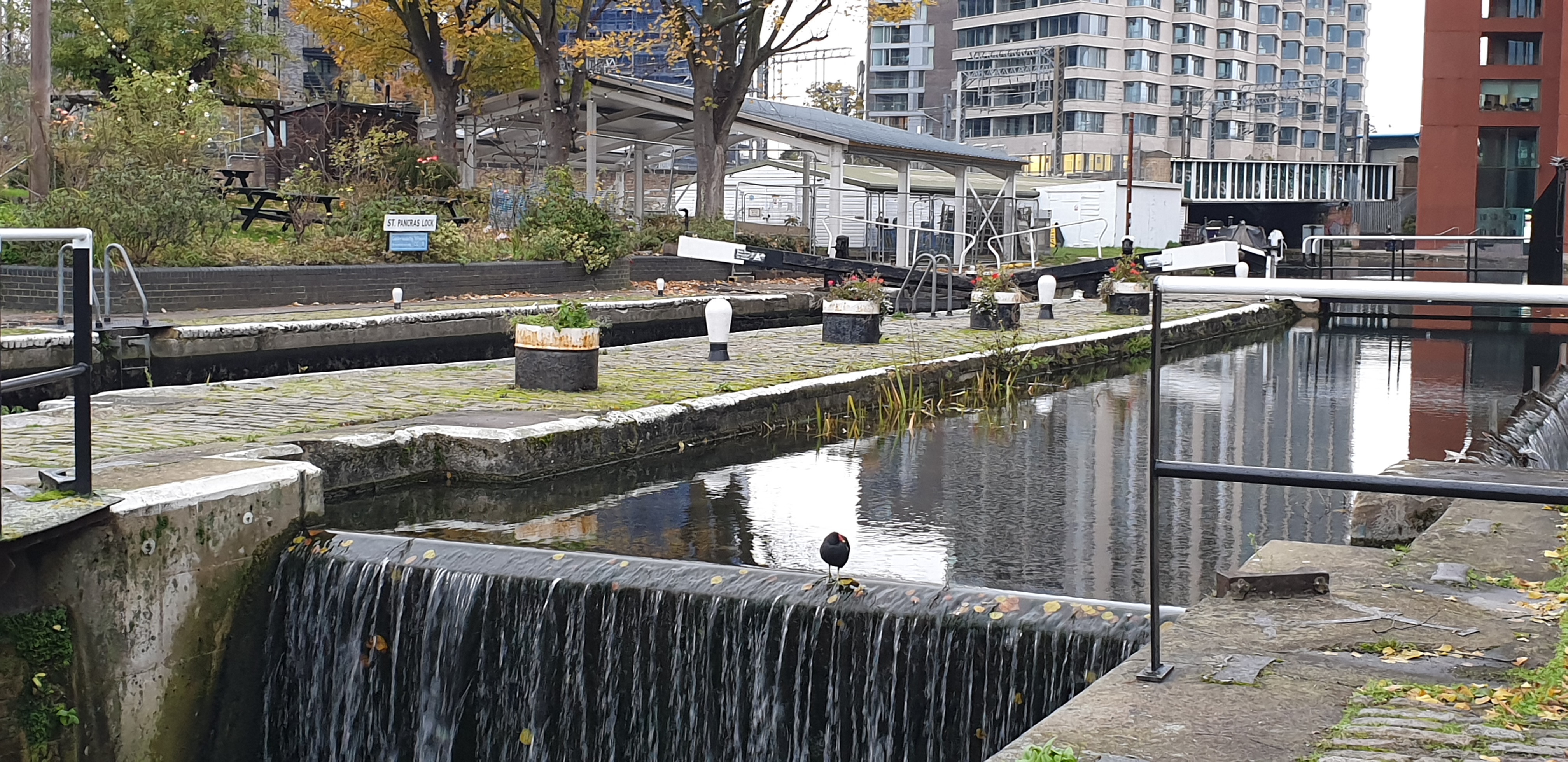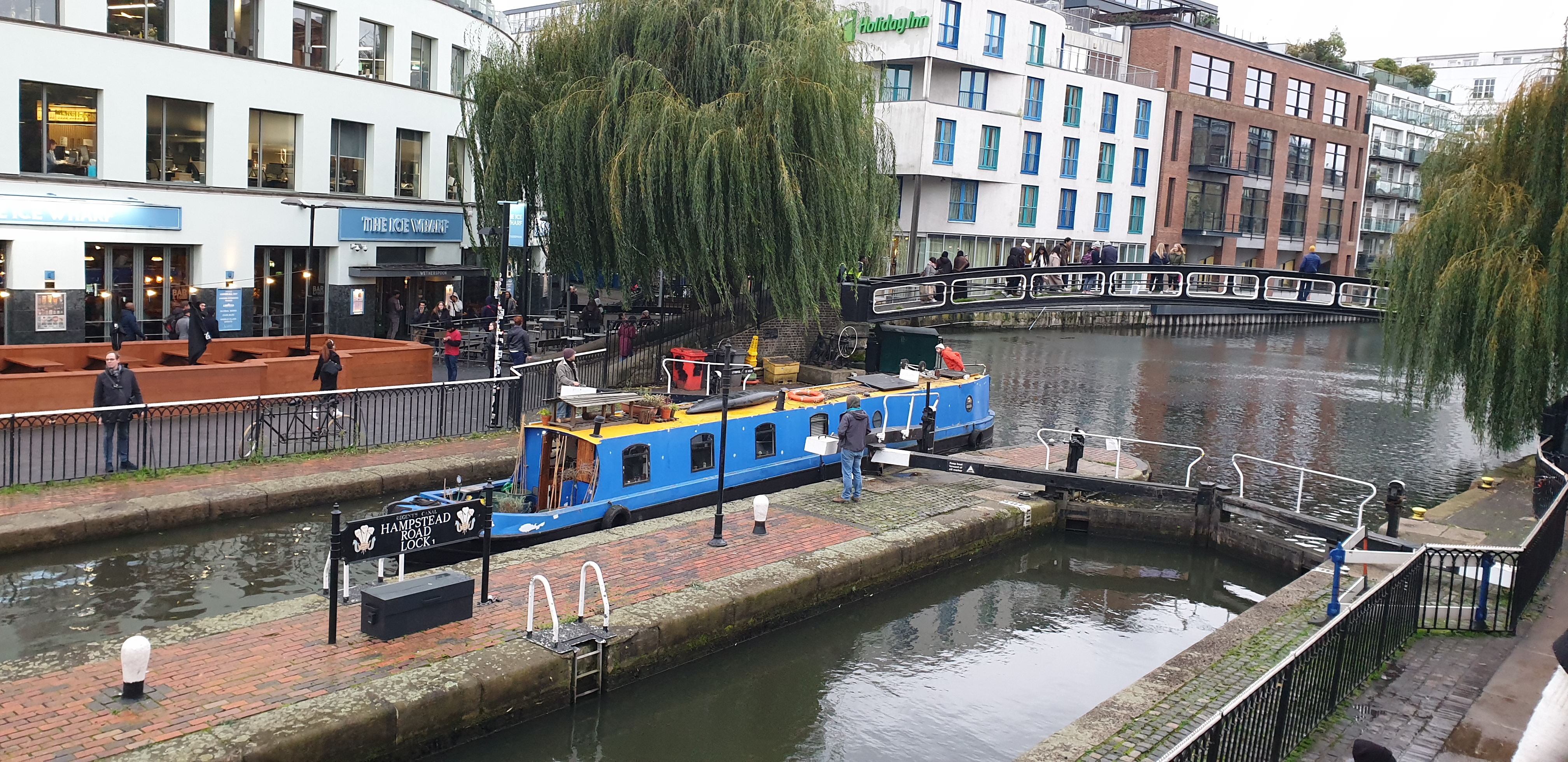 Reaching Camden Locks, we watched a barge go through with critical commentary…