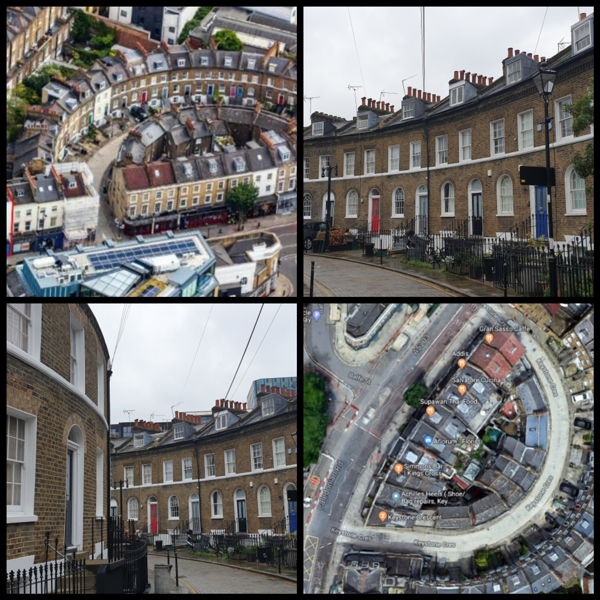 Keystone Crescent, formerly Caledonian Crescent has the smallest radius of any crescent in Europe and is unique in having a matching inner and outer circle.