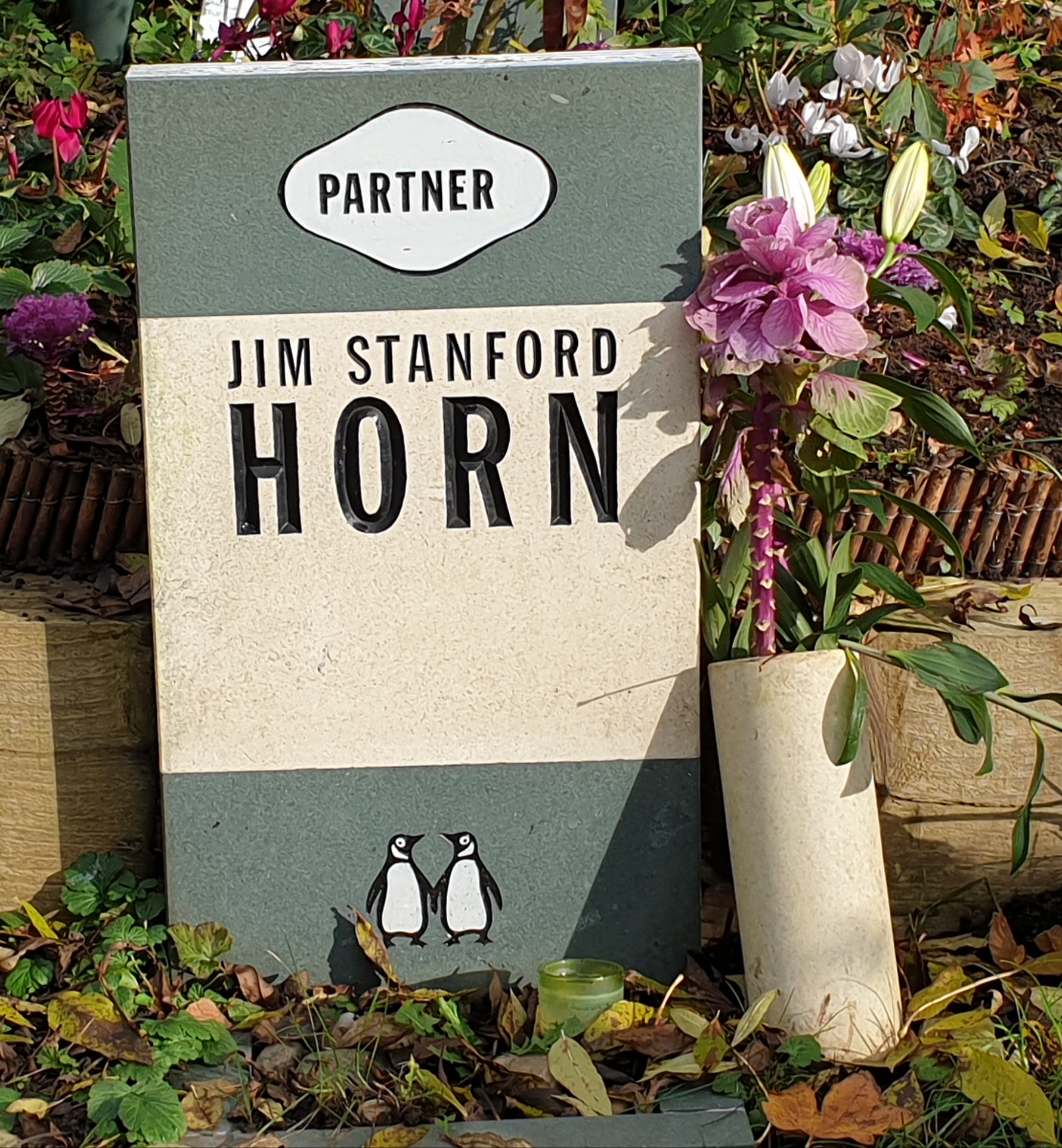 This headstone was a homage to being gay. Note the two penguins holding hands (usually one on the actual books), and the word ‘Partner’ with space left for the usual ‘s’. Jim Horn lived 1976-2010.