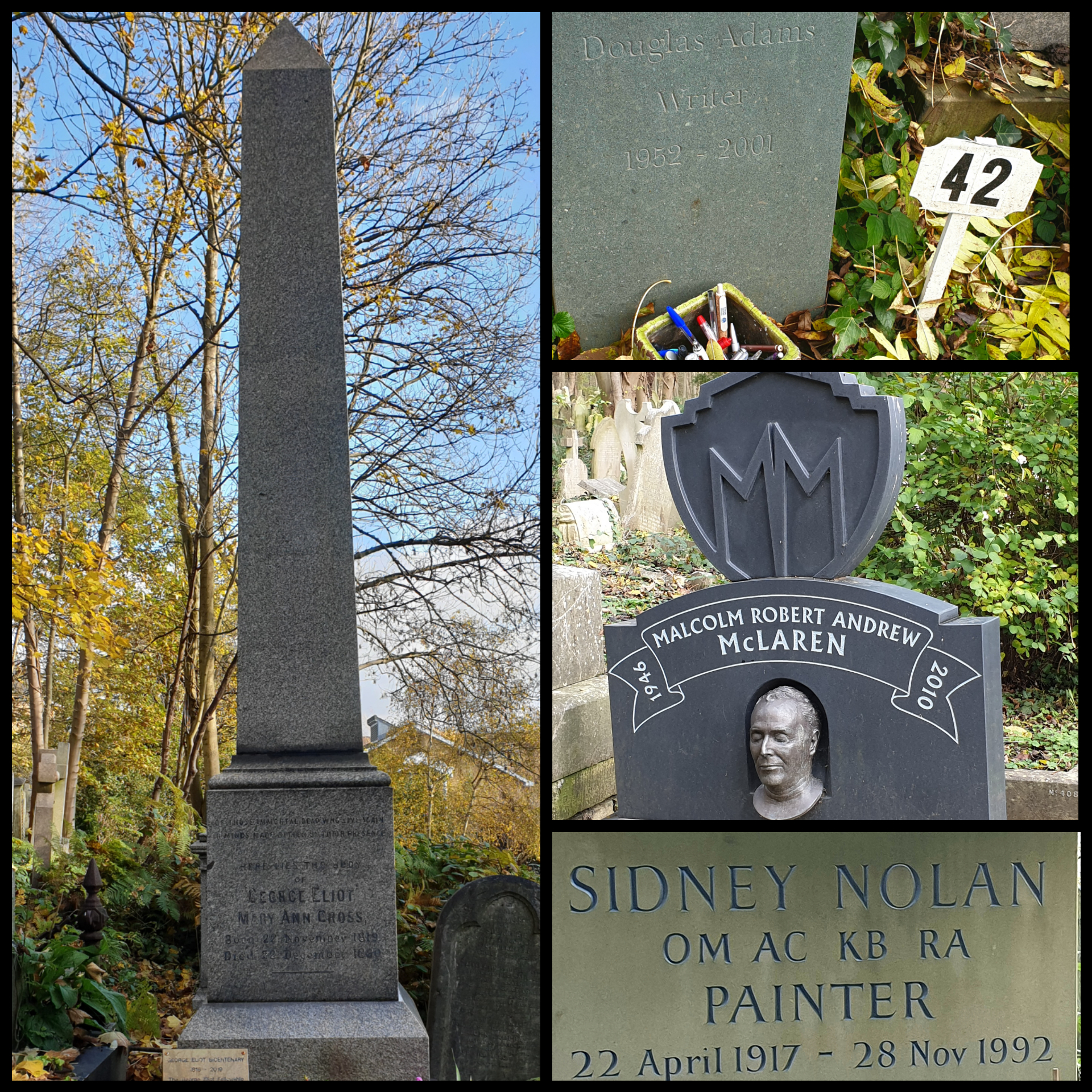 George Eliot (novelist), Douglas Adams (Hitchhiker’s Guide to the Galaxy), Malcolm McLaren (Sex Pistols) and Sidney Nolan.