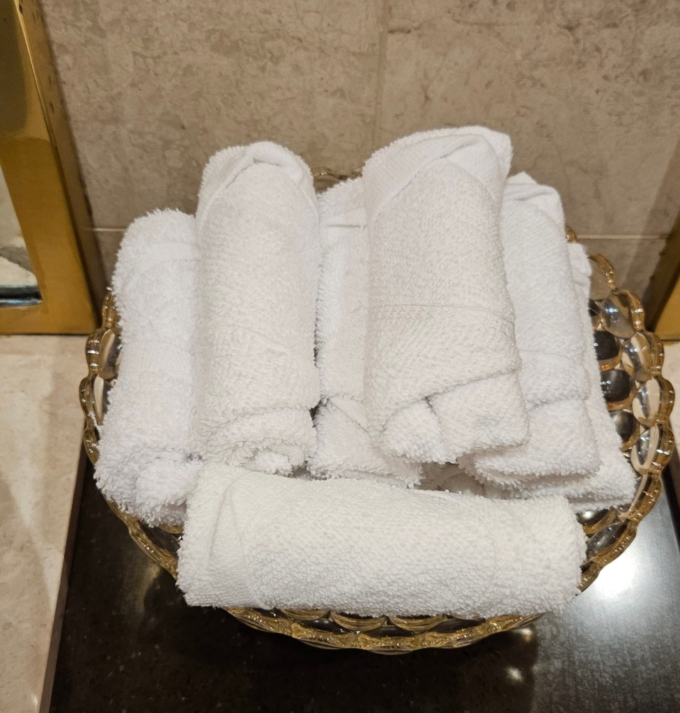 And imagine my delight when visiting the ladies facilities to find the face washers rolled and tucked in the style of my towels at home, a trick I haven’t been able to perfect at all. The lovely lady attendant patiently showed me how it was done. I’m sure she thought I was crazy!