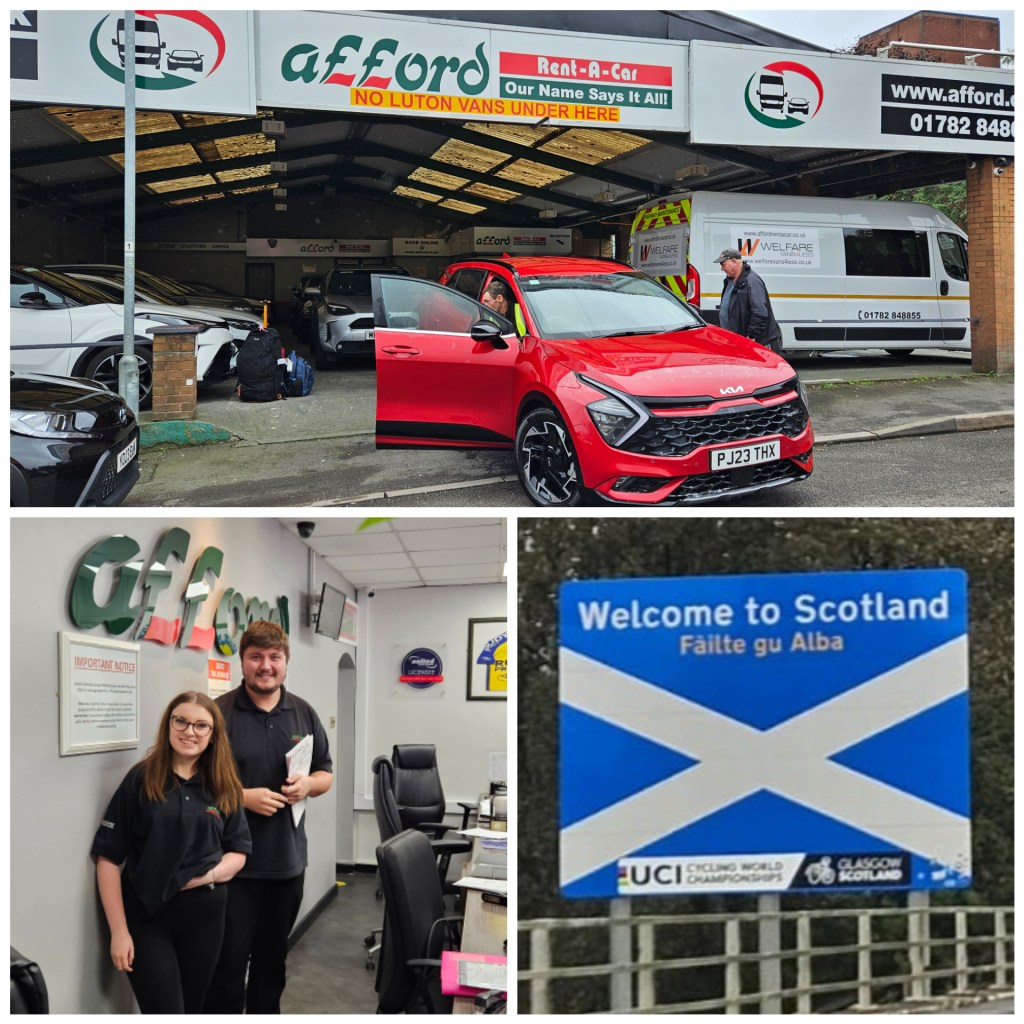 Stunningly, within 30 minutes of arriving, we took possession of our bright red Sportage and were winging our way north on the M6 to Glasgow.