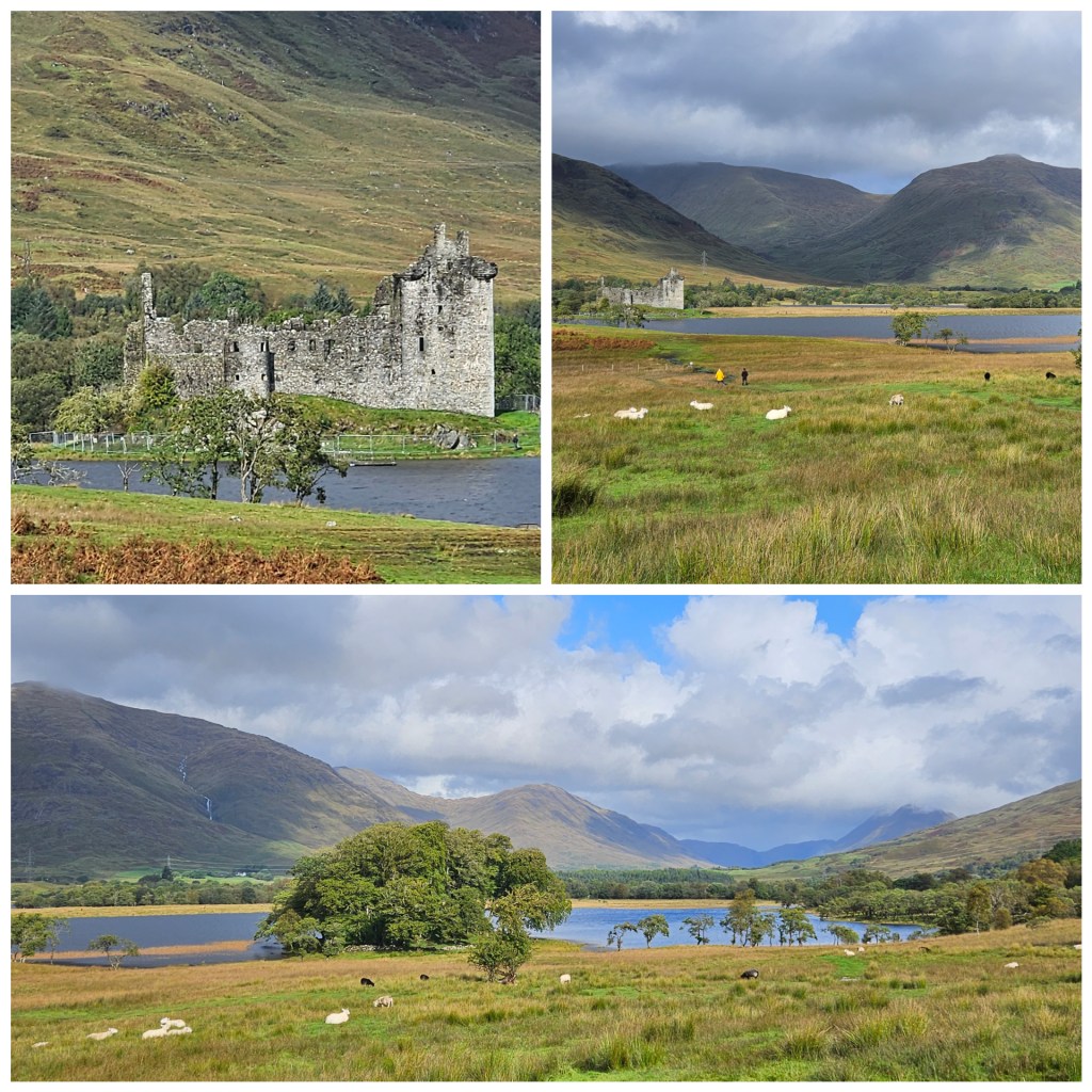Leaving the hum of the A83 behind us, we peeled off to the quietness of a smaller road, following Loch Awe to the ruins of Kilchurn Castle. Very picturesque, it sits in the middle of a paddock of grazing sheep.