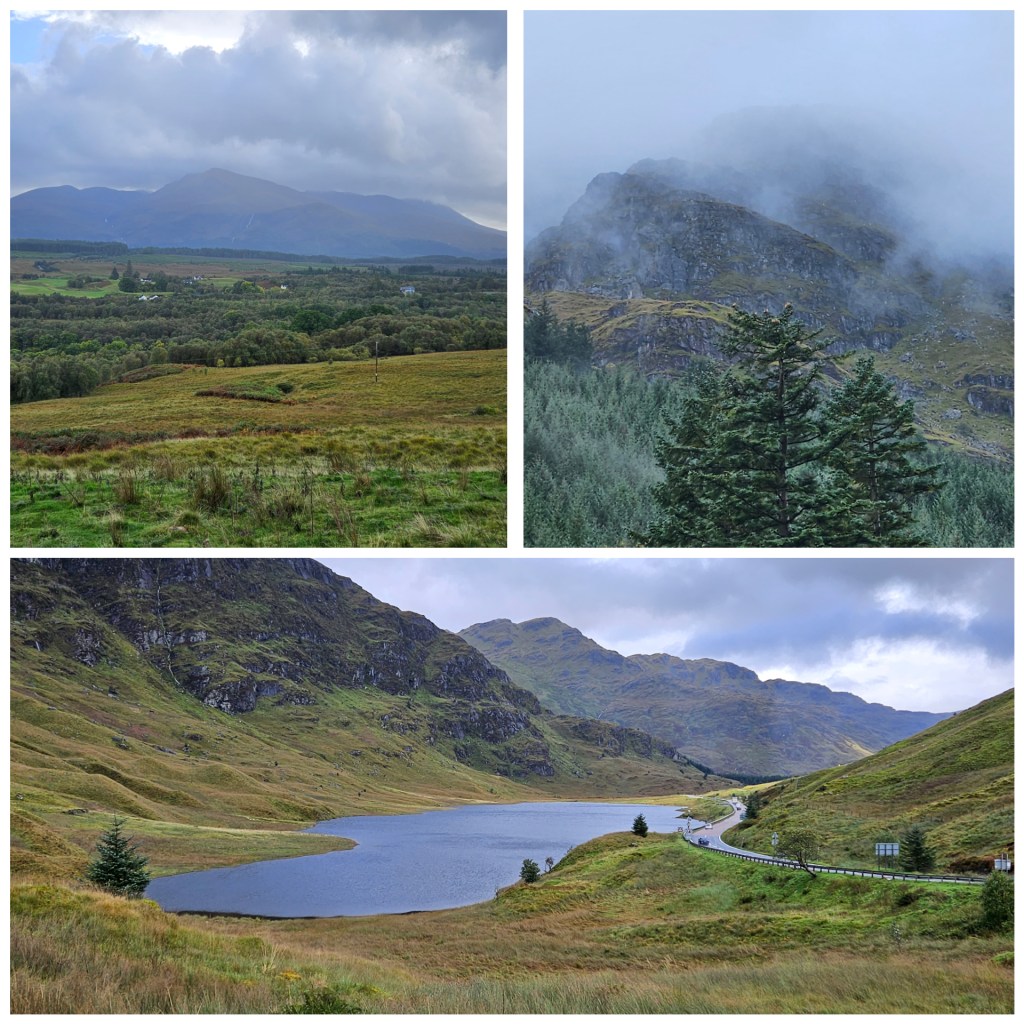 The gentle climb up Glen Croe was damp, the mountains shrouded in mist, but upon reaching the viewpoint at the Rest and Be Thankful lookout, the wind blew in some better weather.