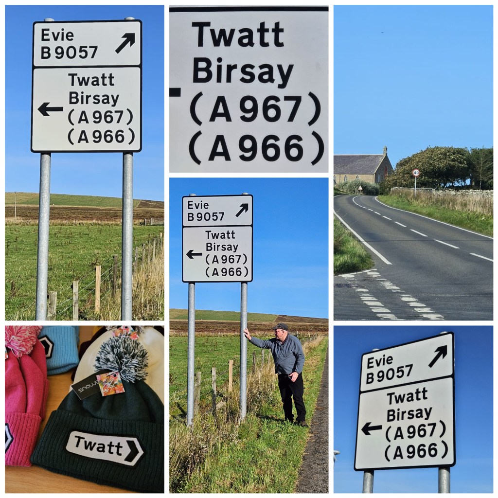We only found one sign, and believe you me, we came into Twatt from multiple directions! Twatt is, in fact, no more than a couple of houses and a church. We suspect all evidence of its name had been obliterated by the locals who were sick and tired of silly tourists invading their ‘village’ for silly photographs. But someone must have realised the commercial potential, as later in the day we found some cool beanies. At £24 each, we figured we’d be Twatts to buy them!