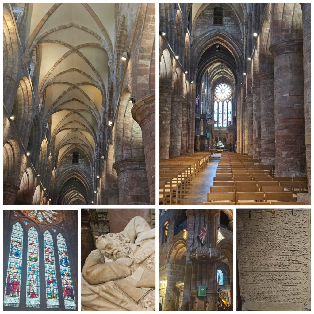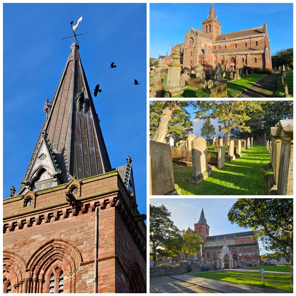 Completely dominating the town, the cathedral is constructed from distinctive red sandstone and dates from the early 12th century. Earl Rognvald Brusason commissioned the cathedral in 1137 in the name of his martyred uncle, Magnus Erlendsson, who was murdered on Egilsay in 1117. Why was he murdered? Political and family differences, apparently. Magnus’ remains were originally buried at Bursay, where we were yesterday, but were moved to the cathedral and entombed in a pillar.