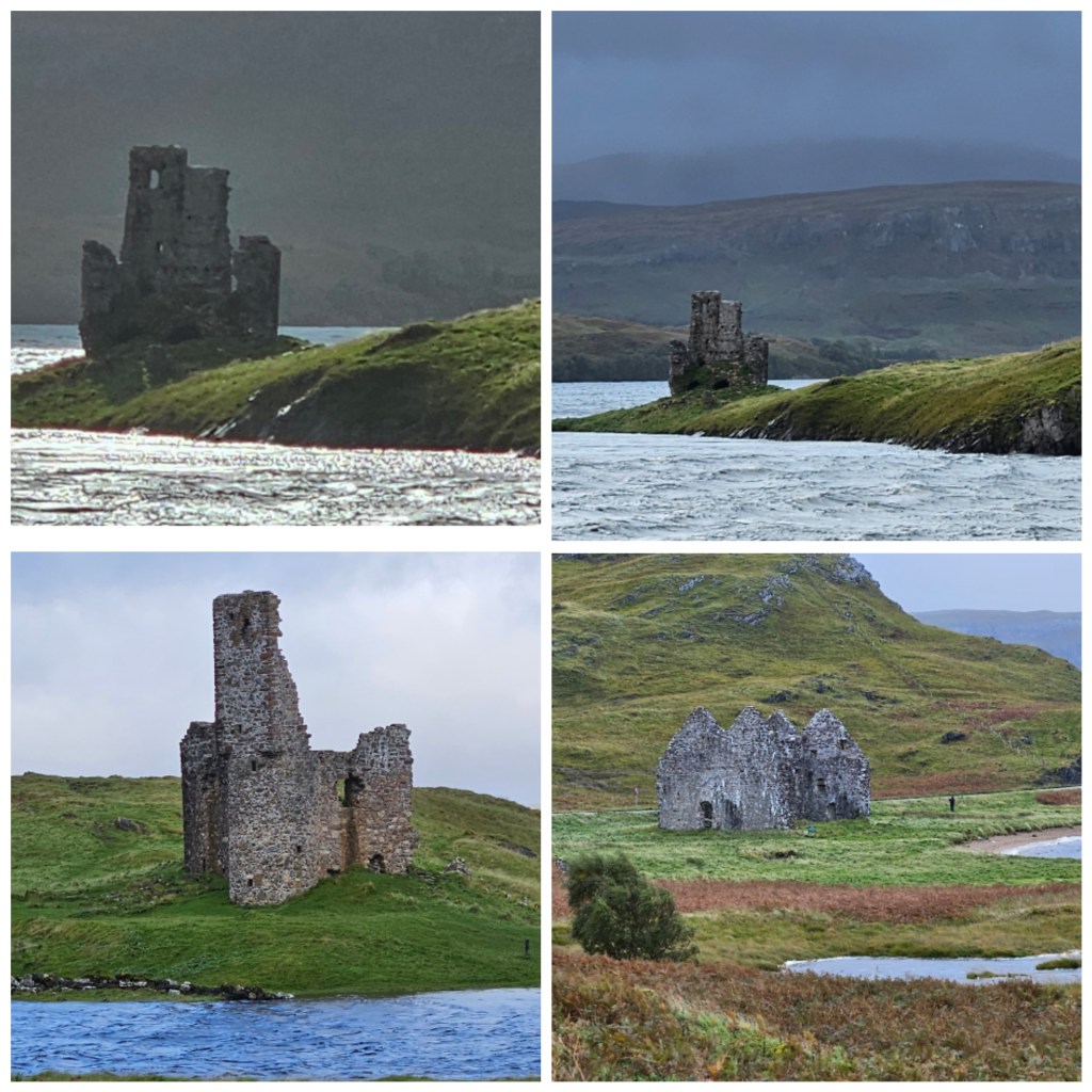 Originally built in the late 15th century, Ardvreck Castle was scene to much bloody mayhem, murder and skulduggery between the MacLeod and MacKenzie clans. But it was certainly serene and peaceful today. While the rain had a breather, we scurried over to the loch shoreline to take a look. Nearby were the ruins of Calda House, built in 1726 by Kenneth MacKenzie for his wife Frances, who did not care for the austerity of Ardvreck Castle!